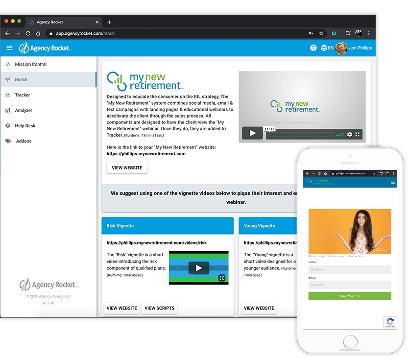 Reach is a powerful prospecting system designed to attract, educate, and guide leads toward securing an Indexed Universal Life (IUL) policy. It features personalized agent landing pages, lead capture forms, professional teaser videos, an educational webinar, and the Savings Snapshot system, all integrated into My New Retirement. With seamless Tracker integration, Reach automates marketing and follow-ups, helping agents convert prospects efficiently.