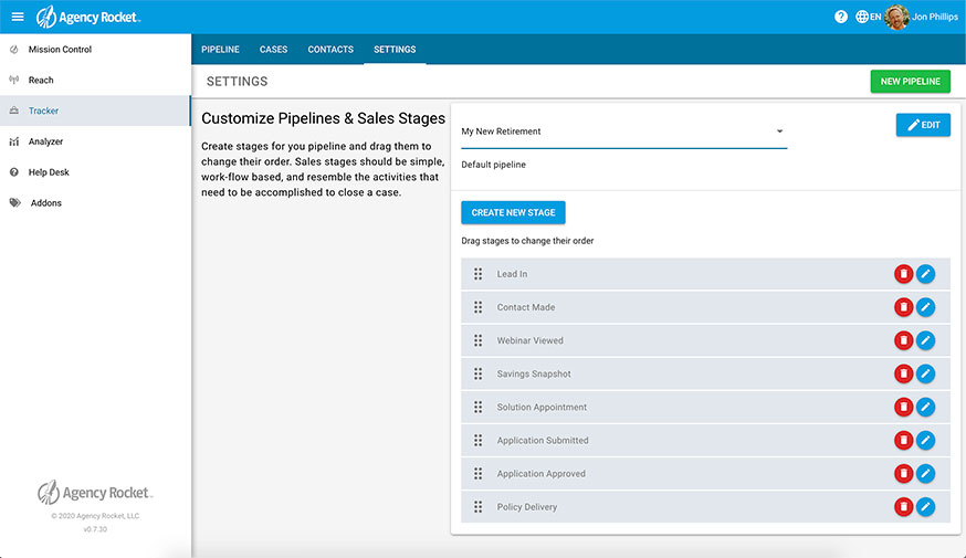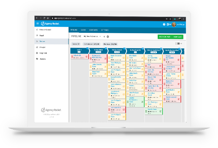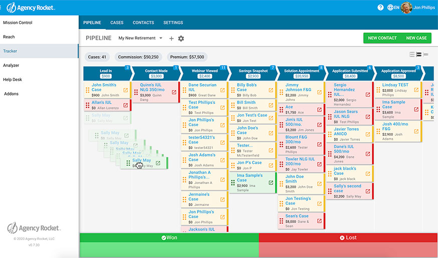 Cases are color coded so you can quickly see what needs your immediate attention. They can be dragged to the next stage in the sales pipeline or they are moved automatically as the prospect interactes with the "My New Retirement" website.