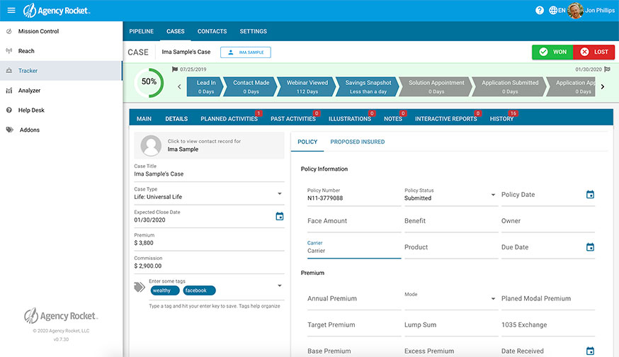 Tracker’s main pipeline view lets you see all your open cases on one screen showing what sales stage they are in and what actions are needed to progress to the next stage in the sales process. It allows you to see your pipeline clearly and take the actions that matter. It is fully customizable to fit your unique sales process.